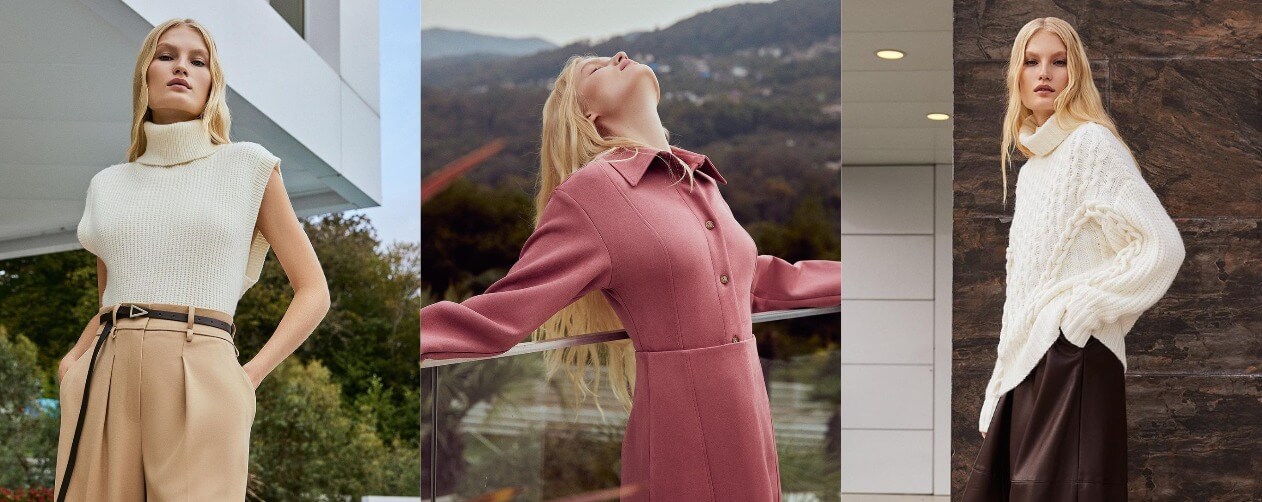 Основу линейки составили мягкие трикотажные изделия, а также контрастные им вещи из фактурной эко-кожи и замши. В новую коллекцию вошло несколько фасонов свитеров, в том числе удлиненный оверсайз, ассиметричный, с высоким горлом, разрезами, крупной вязкой, вязаный жилет, акцентная водолазка с подплечниками, джемпер с объемными рукавами, шерстяное платье, а также комплект из расклешенных брюк и удлиненным кардиганом в рубчик. Каждая из моделей идеально подойдет для создания теплых осенне-зимних образов.