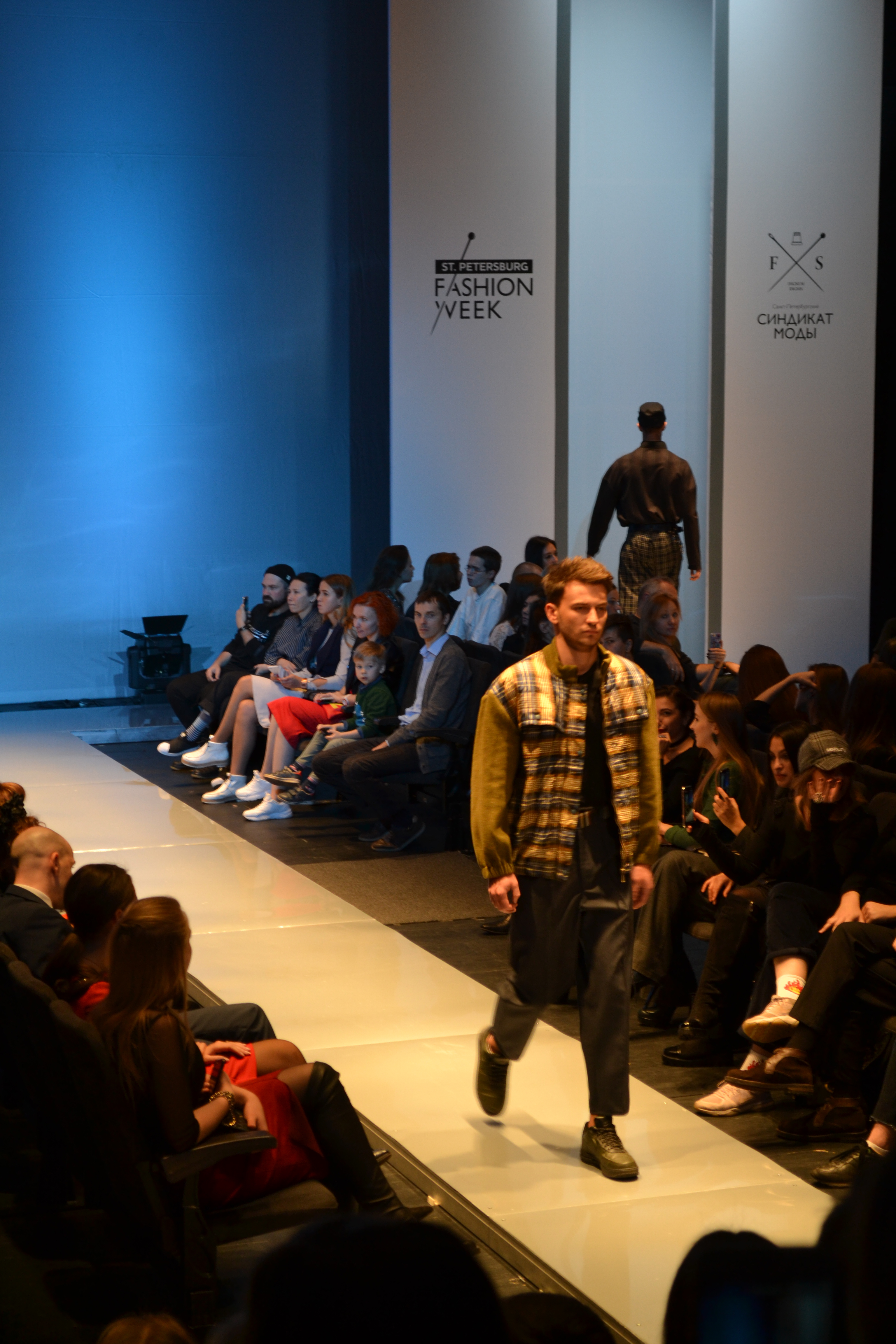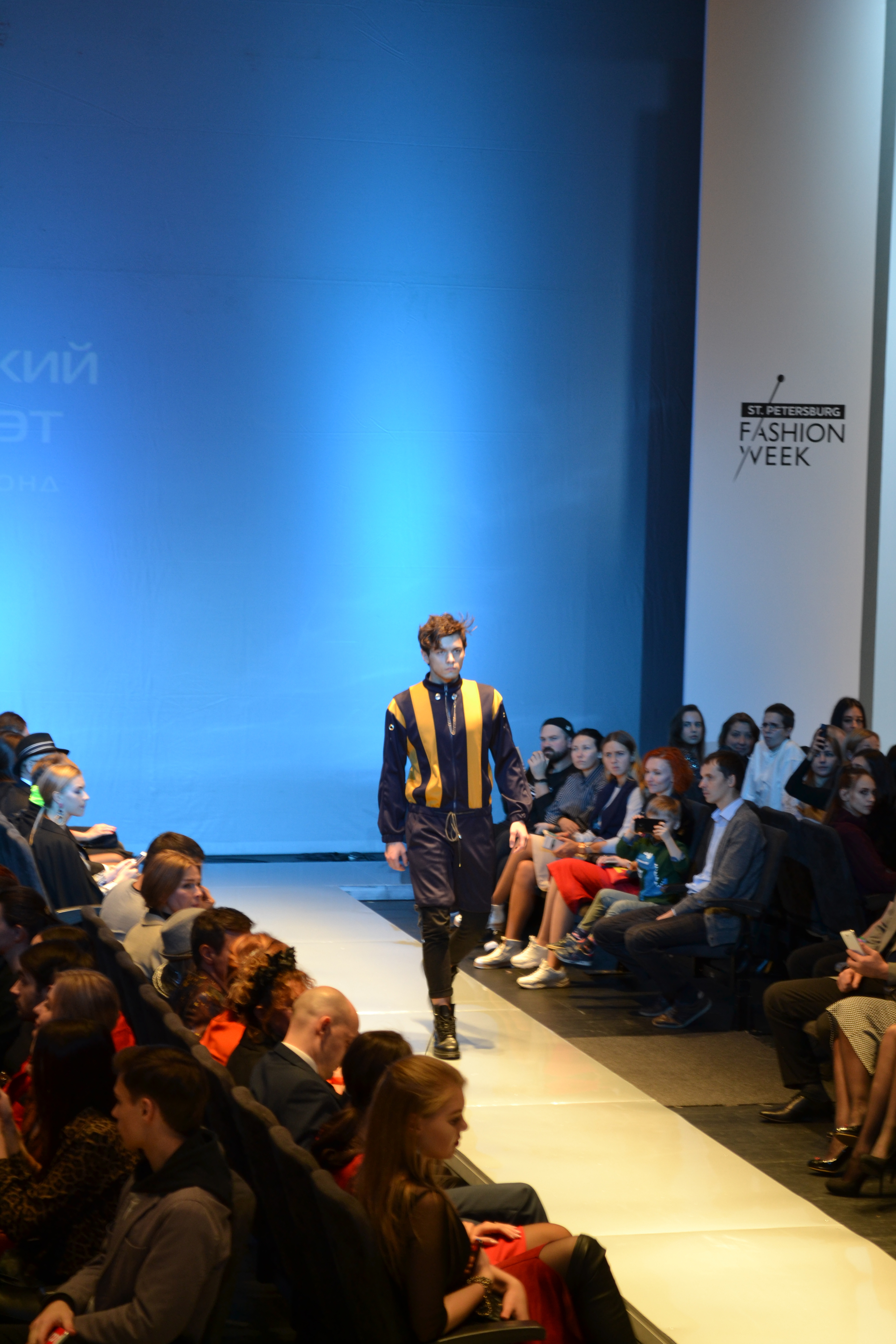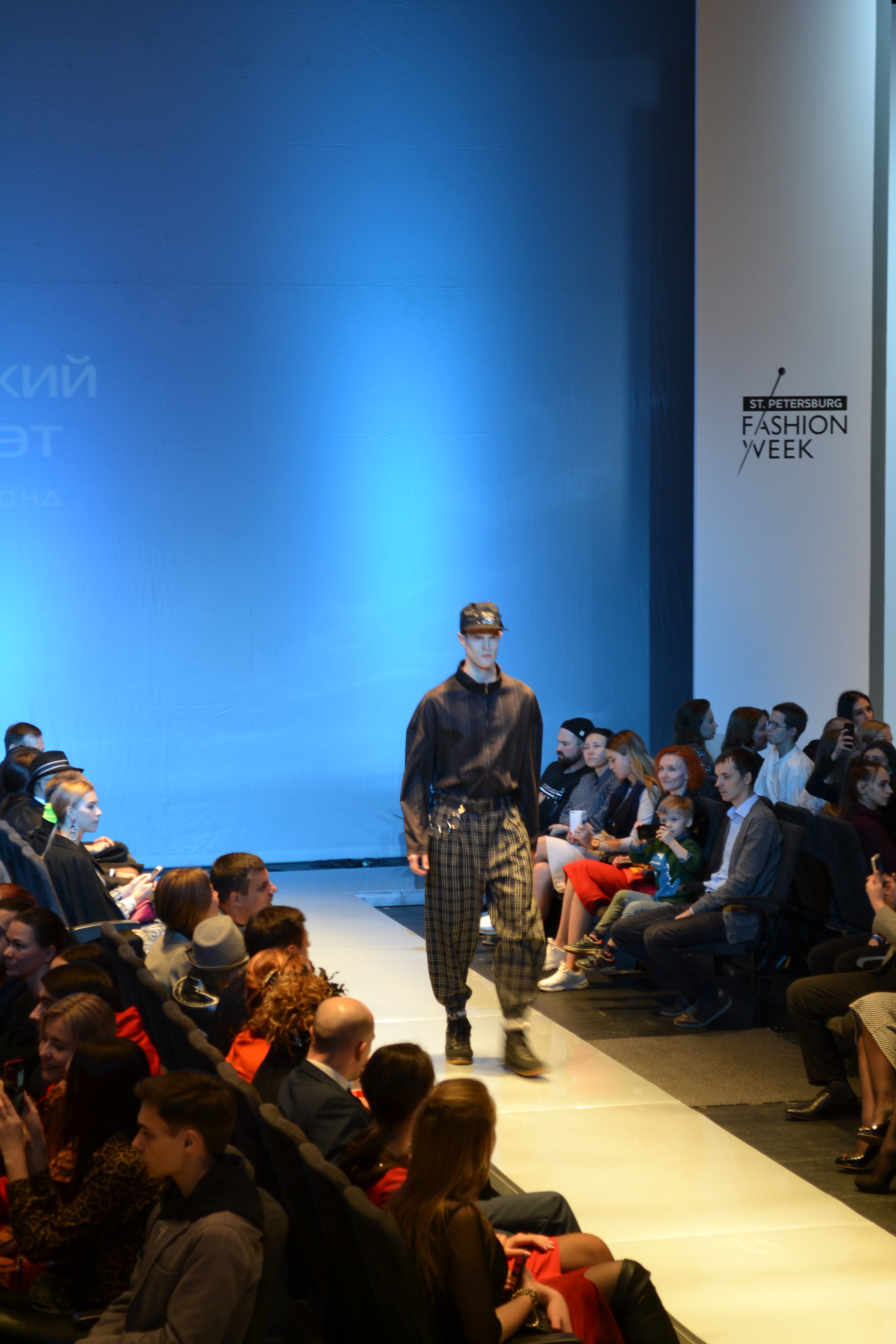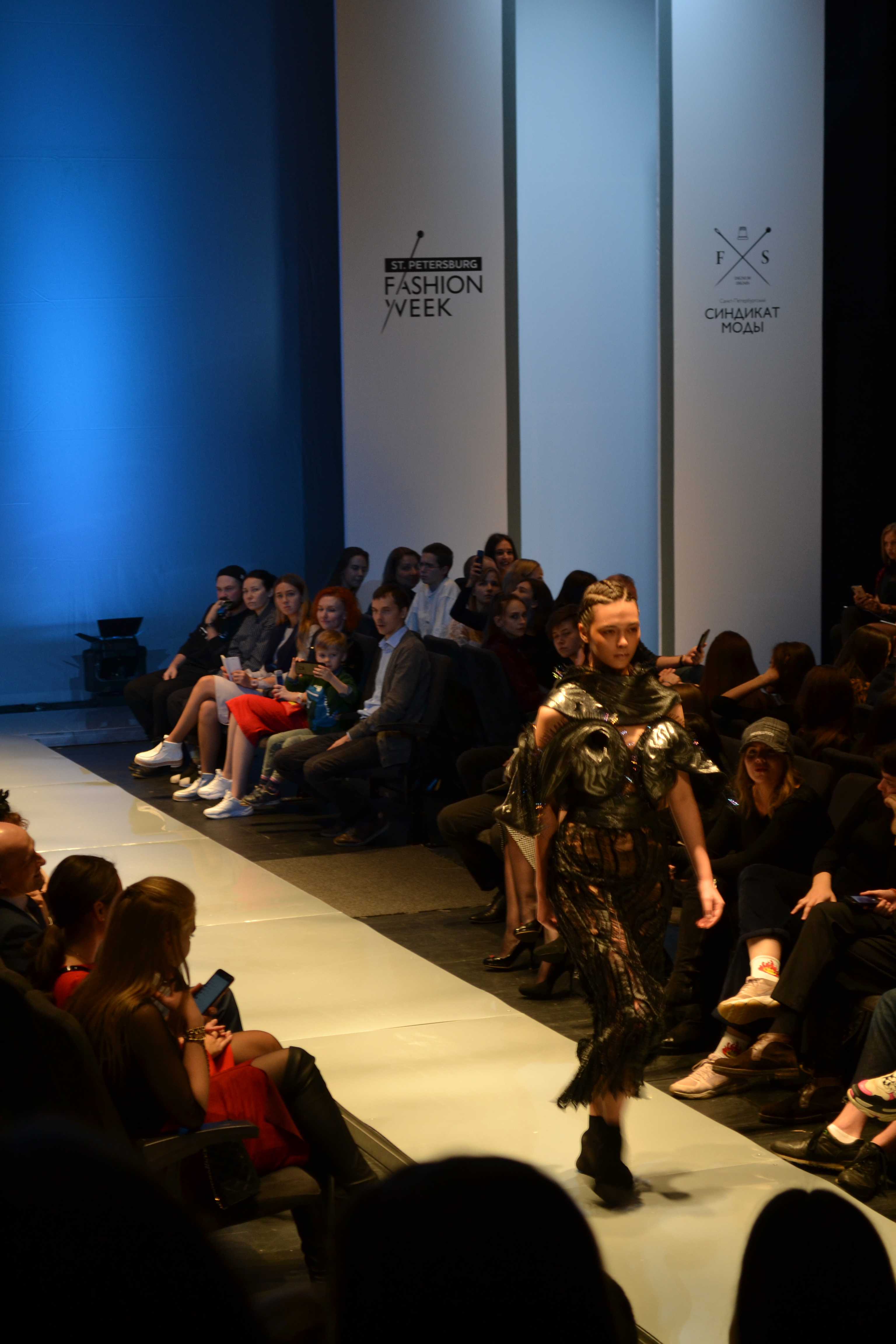 Несмотря на модные события и конференции завершающего дня, посмотреть на работы молодых дизайнеров собрался полный зал. Оформители выстроили подиум зигзагом – благодаря этому все гости смогли рассмотреть сложную архитектуру и цветовое решение моделей.